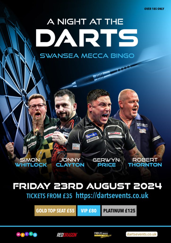 Take on one of our star players on stage, in front of a vibrant audience! Limited to one game per person. Gerwyn Price, Jonny Clayton, Simon Whitlock, and Robert Thornton will be stepping up to the oche at Mecca Bingo in Swansea on the 23rd of August.
