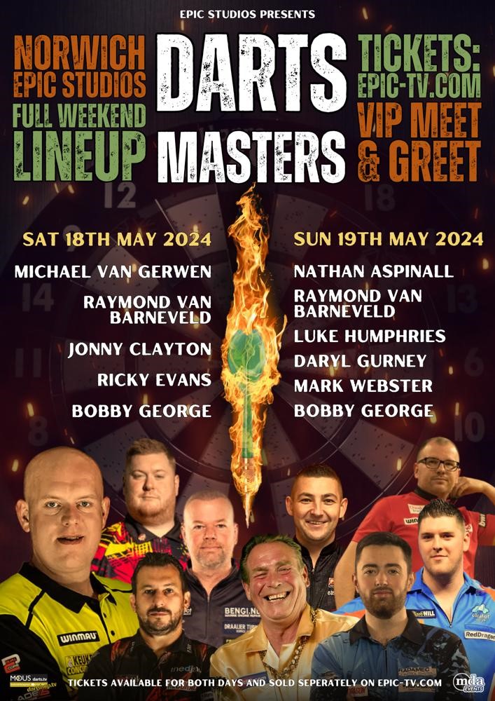 Some prominent figures in the world of darts will gather at Epic Studios on May 18th for an exciting live exhibition, an opportunity for fans to meet and interact, and an overall enjoyable experience with the residents of Norwich and Norfolk.